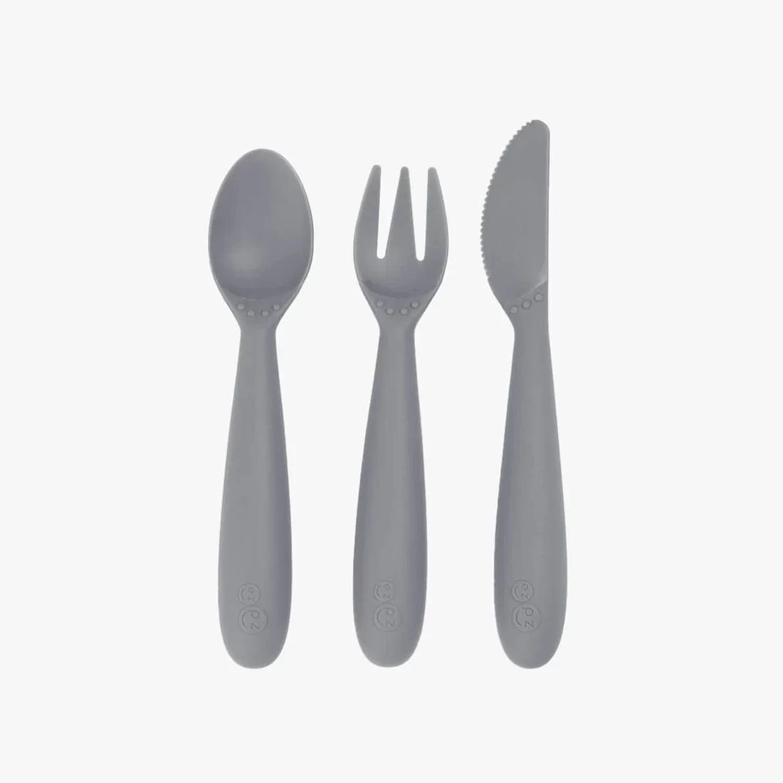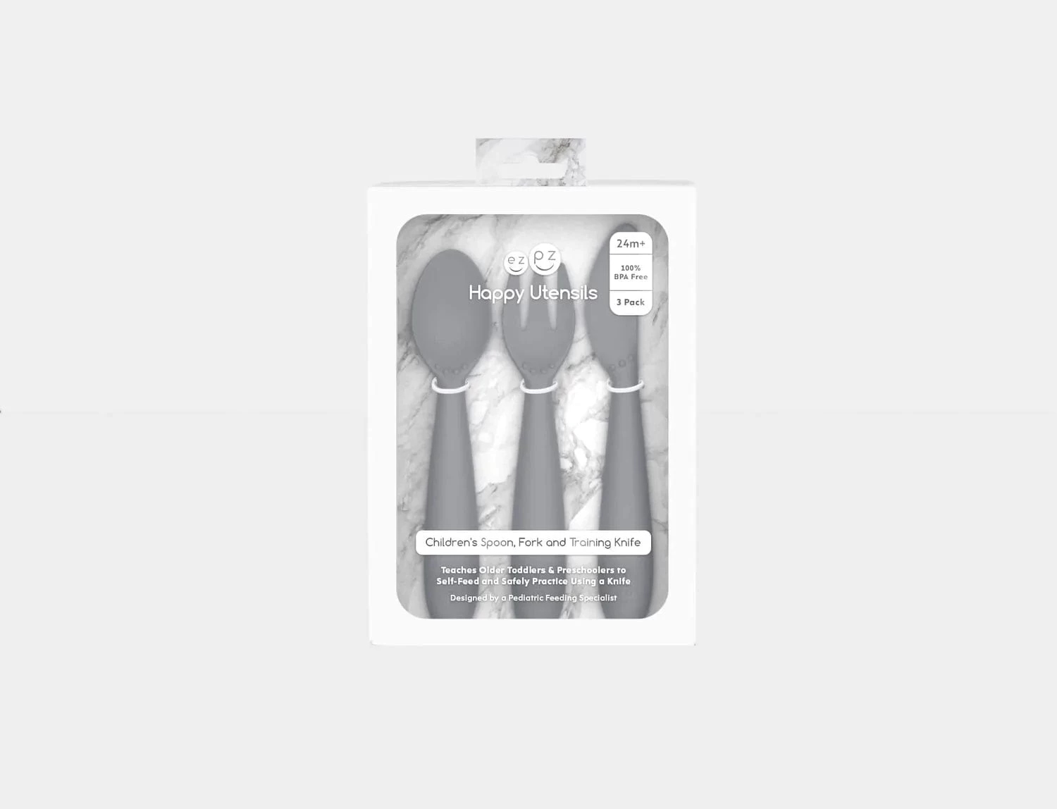 Learning self-feeding skills with utensils is an important developmental milestone. The ezpz Happy Utensils are designed to help older toddlers / preschoolers independently eat with a spoon and fork, and safely practice using a knife (spreading + cutting).