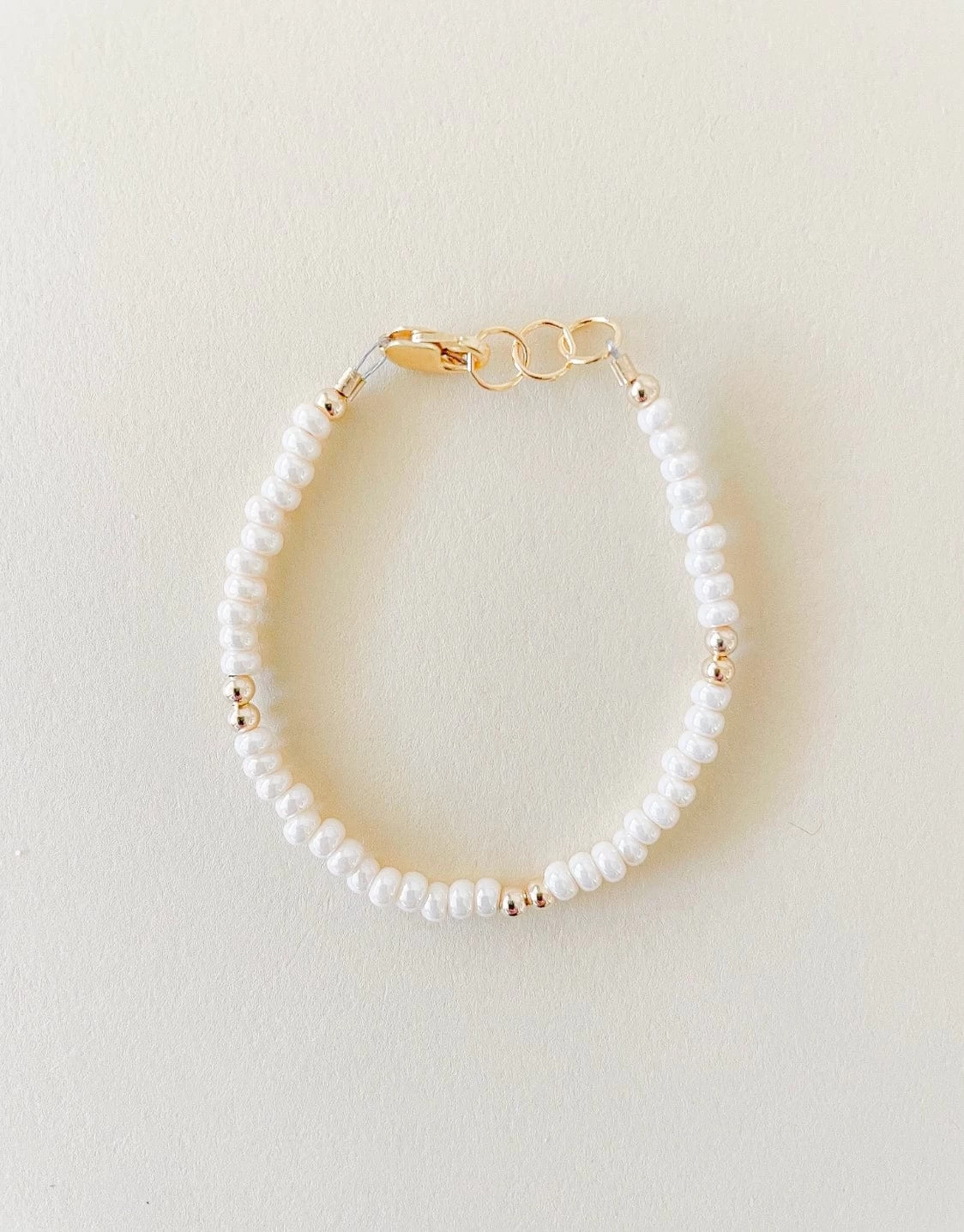 This darling cream layer bracelet is the perfect amount of dainty for your little one. Made with 11/0 cream seed beads and gold filled beads set perfectly through out the bracelet.