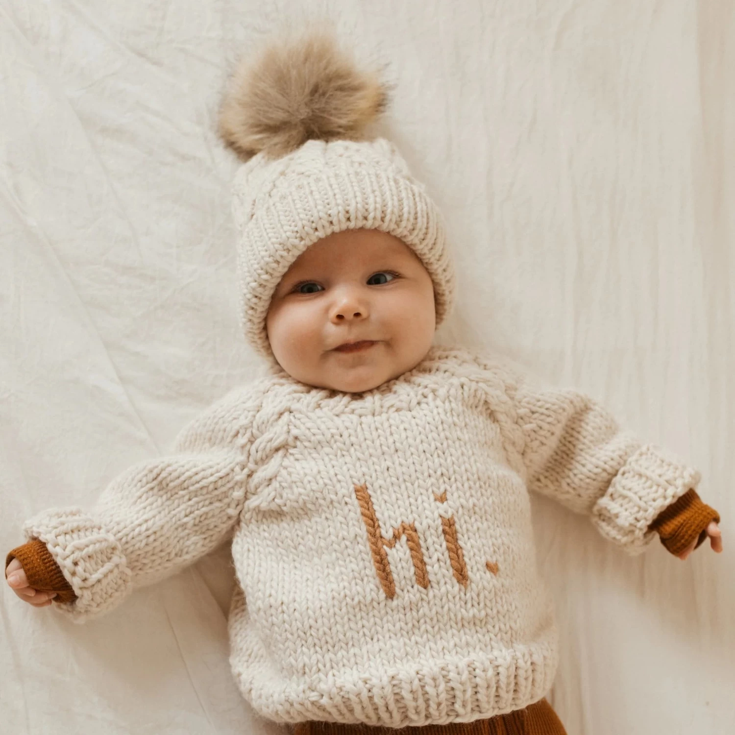 What a fun way to greet the world! Say hi. with our cozy pullover sweater knit in Natural hued yarn. It has cable trim raglan sleeves with hi. knit into the front in Pecan brown yarn. The neck is softly knit, making it easy to pull over little heads. Hand-knit in chunky yarn, it is soft and warm. This is such a great gender neutral sweater, perfect for any little person.