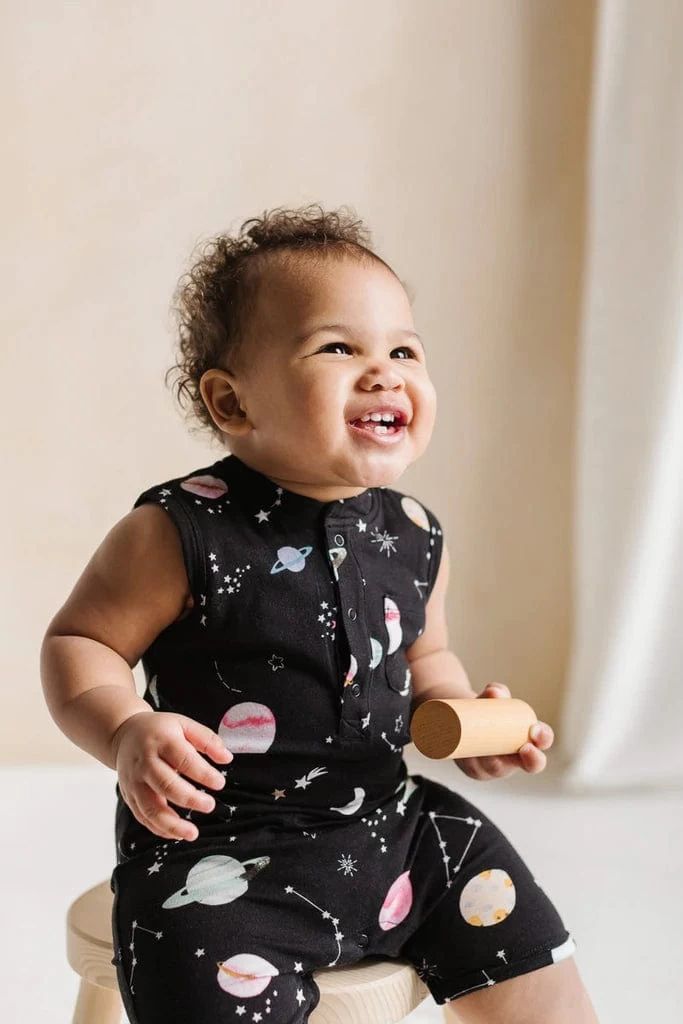 Made from our signature ultra-soft and sustainable Tencel™ Lyocell and organic cotton jersey knit fabric, our baby boy’s short romper is as cute as it is comfortable. It features a stylish tank-styled top, a front pocket, and full snaps opening on the bottom shorts for easy dressing. This stylish romper is made for movers and shakers!