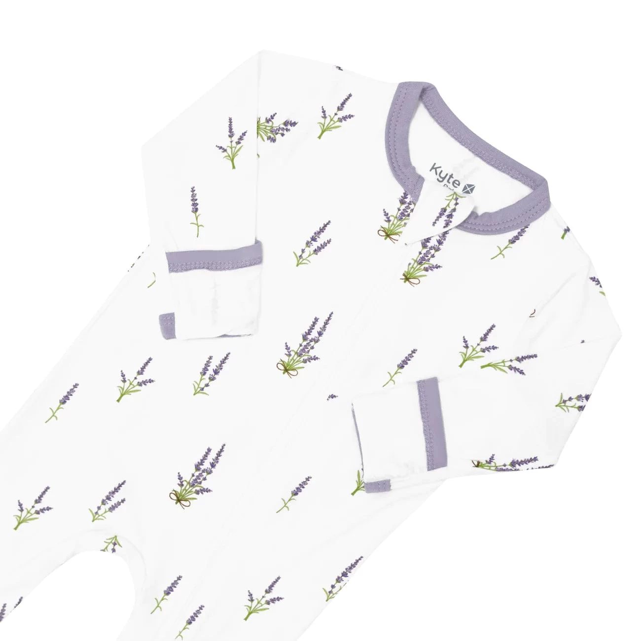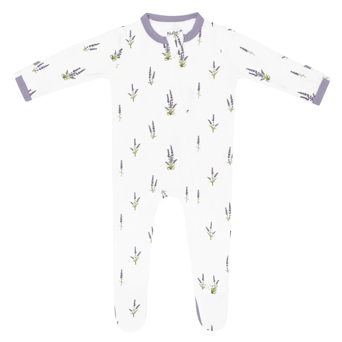An all-over botanical print featuring lavender sprigs and bundles colored in pastel shades of purple and green over a white background.